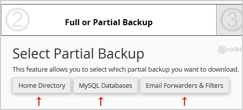 4. La pasul 2, în opțiunea "Full or Partial Backup", sub "Select Partial Backup", apasă pe "Home Directory" pentru a descărca doar directorul Home sau, dacă vrei să descarci doar "MySQL Databases", apasă pe "MySQL Database".