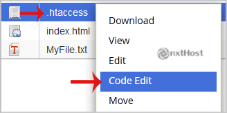 6. Click dreapta pe fișierul .htaccess și apoi alege "Edit" sau "Code Edit" din meniul contextual.