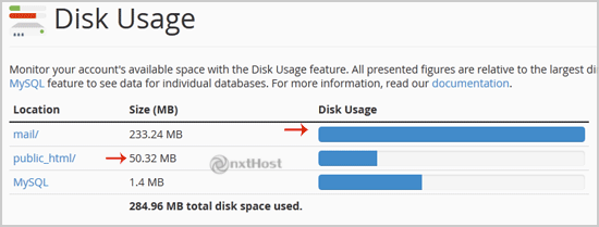 3. În zona Disk Space Usage poți vedea ce foldere/directoare ocupă cel mai mult spațiu și poți verifica inclusiv utilizarea pentru MySQL.