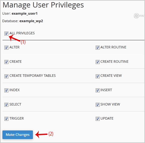 5. La "Manage User Privileges" bifează "ALL PRIVILEGES" și apasă pe "Make Changes".