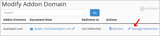 3. La "Modify Addon Domain" găsește domeniul addon și apasă pe "Manage Redirection".