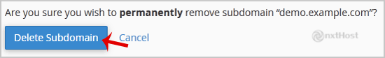5. Vei primi un avertisment că ștergi "subdomain.example.com". Apasă pe "Delete Subdomain" pentru a elimina subdomeniul definitiv.