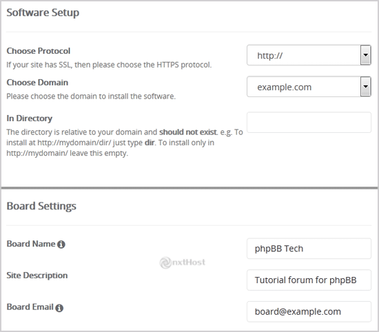 - In Directory: Dacă vrei să instalezi într-un director (de ex. example.com/forums), introdu numele directorului. Altfel, lasă gol pentru instalare în domeniul principal example.com