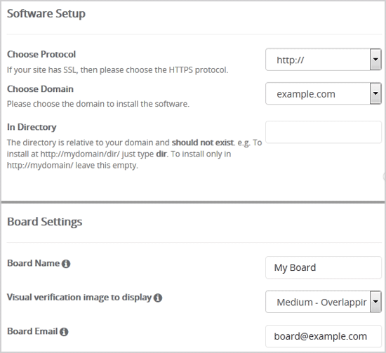 - In Directory: Dacă vrei să instalezi într-un director (de ex. example.com/forums), introdu numele directorului. Altfel, lasă gol pentru instalare în domeniul principal example.com