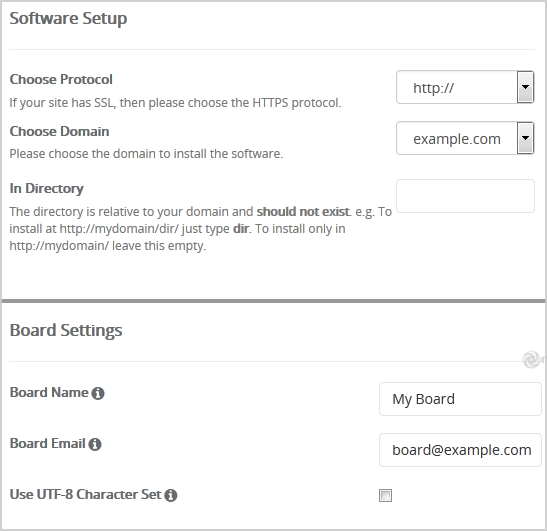- In Directory: Dacă vrei să instalezi într-un director (de ex. example.com/forum), introdu numele directorului. Altfel, lasă gol pentru instalare în domeniul principal example.com