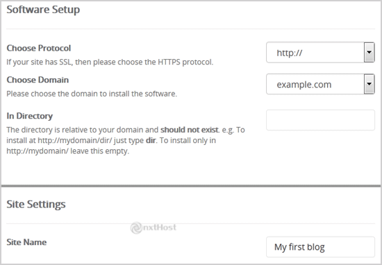 - In Directory: Dacă vrei să instalezi într-un director (de ex. example.com/directory), introdu numele directorului. Altfel, lasă gol pentru instalare în domeniul principal example.com
