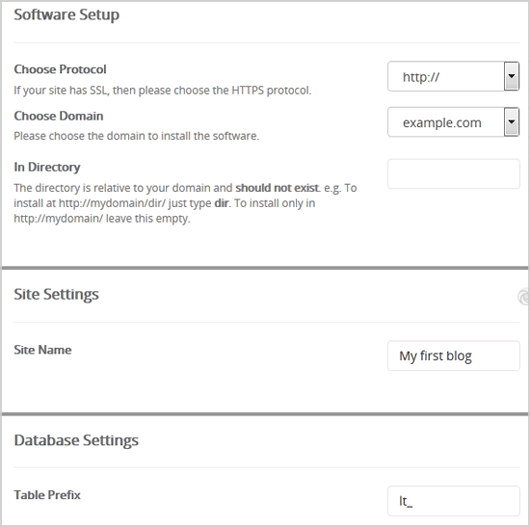 - In Directory: Dacă vrei să instalezi într-un director (de ex. example.com/directory), introdu numele directorului. Altfel, lasă gol pentru instalare în domeniul principal example.com
