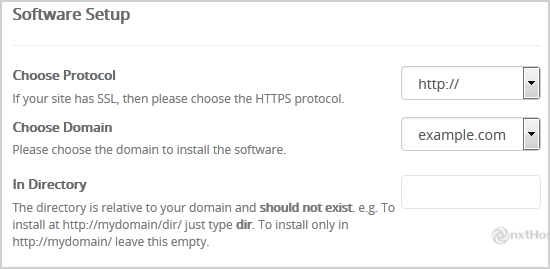 - In Directory: Dacă vrei să instalezi într-un director (de ex. example.com/directory), introdu numele directorului. Altfel, lasă gol pentru instalare în domeniul principal example.com