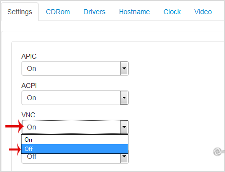 3. Derulează în jos; în tab-ul "settings" vei găsi APIC, ACPI, VNC și PAE. De exemplu, dacă vrei să oprești VNC, selectează "Off" din meniul drop-down al opțiunii VNC.