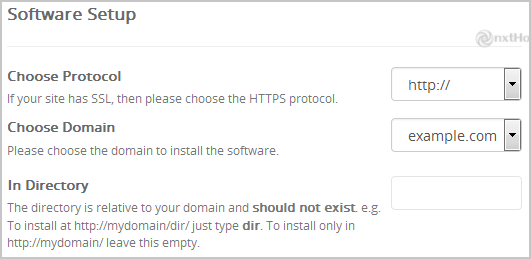 • In Directory: Dacă vrei să instalezi într-un director (de ex. example.com/directory), introdu numele directorului. Altfel, lasă gol pentru instalare în domeniul principal example.com