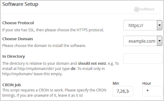 - In Directory: Dacă vrei să instalezi într-un director (de ex. example.com/directory), introdu numele directorului. Altfel, lasă gol pentru instalare în domeniul principal example.com