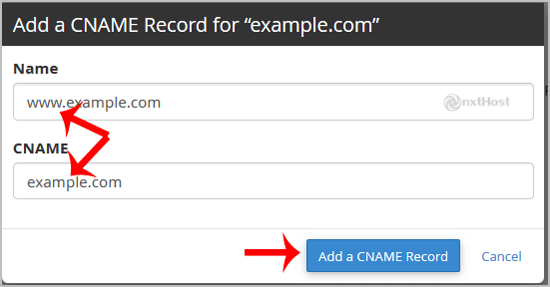 Name: Introdu numele pe care vrei să îl adaugi; de exemplu "www", iar cPanel va crea automat www.example.com.