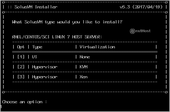 Va afișa o opțiune pentru alegerea virtualizării. Deoarece instalăm SolusVM Master, alege Opțiunea 1.