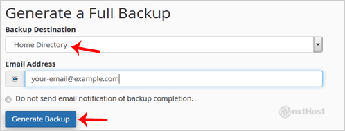 4. Din lista derulantă, selectează destinația backup-ului ca "Home" și introdu adresa ta de email în câmpul de email, ca să primești notificare când backup-ul este finalizat.