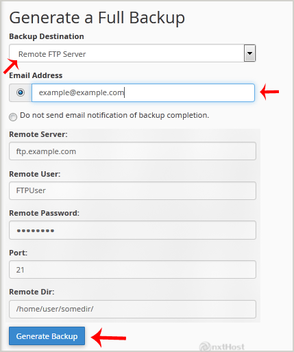 5. După ce completezi detaliile FTP Remote, apasă pe butonul "Generate Backup".