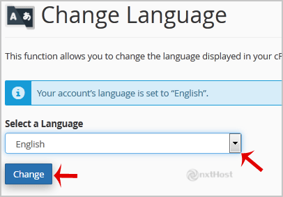 3. Din pagina de configurare a limbii cPanel, alege limba dorită din meniul derulant și apoi apasă pe butonul "Change".