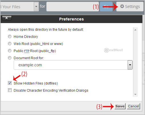 5. Dacă fișierul .htaccess nu se vede, apasă pe butonul "Settings" din File Manager (în partea dreaptă sus). Se va deschide o fereastră mică. Bifează opțiunea "Show Hidden Files (Dotfiles)" și apasă pe "Save". Acum ar trebui să vezi fișierul .htaccess. Dacă nu există, creează unul nou.