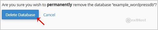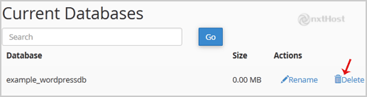 3. La "Current Databases" vei vedea lista bazelor de date. Găsește baza de date pe care vrei să o elimini și apasă pe pictograma "Delete".