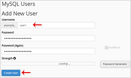 3. La "MySQL Users", în câmpul "Username" introdu numele noului utilizator.