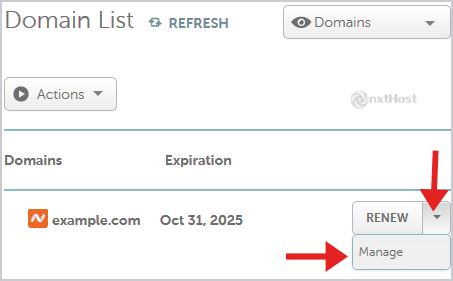 3. În lista de domenii, în dreptul domeniului apasă pe meniul drop-down și selectează "Manage".