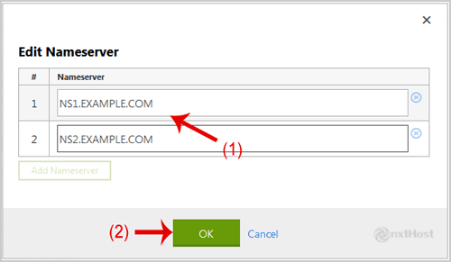 7. Introdu nameserver-ele în câmpurile 1 și 2 și apasă pe "OK".