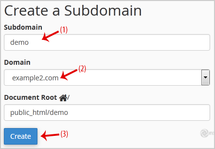 3. La "Create a Subdomain", în câmpul "Subdomain" introdu numele subdomeniului, de ex. "demo" (fără ghilimele). Dacă ai mai multe domenii, alege domeniul potrivit din lista drop-down.