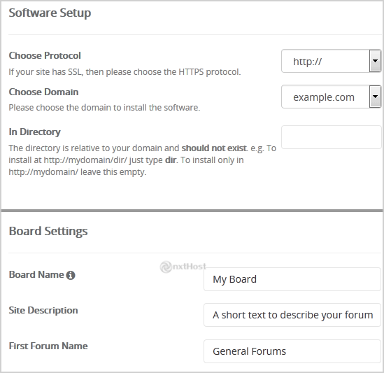 • In Directory: Dacă vrei să instalezi într-un director (de ex. example.com/forum), introdu numele directorului. Altfel, lasă gol pentru instalare în domeniul principal example.com
