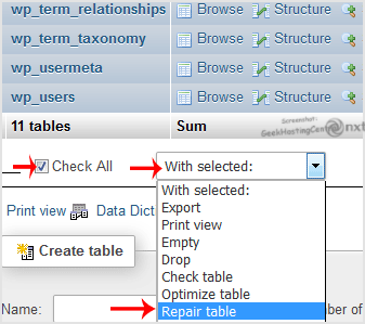 5. Derulează în jos, bifează "Check All" și din lista drop-down selectează "Repair table".