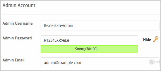 • Admin Username: Noul tău username Open Real Estate (din motive de securitate nu folosi "Administrator" sau "Admin".)