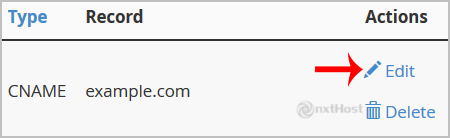 Găsește recordul CNAME pe care vrei să îl editezi sau să îl ștergi. Pentru editare, apasă pe "Edit", modifică detaliile și apoi apasă pe "Save Record". Pentru ștergere, folosește opțiunea "Delete".